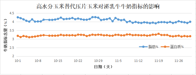 2、高水分玉米替代压片玉米乳脂肪降低0.22百分点,乳蛋白基本无变化。
